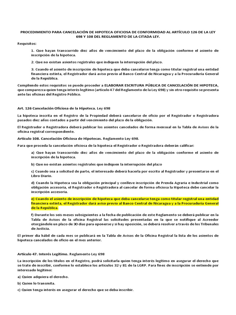Decreto Ley De La Prenda Y La Hipoteca - Procedimiento Para Cancelacion De Hipoteca Oficiosa De Conformidad Al Articulo 126 De La Ley 698 Y 108 Del Reglamento De La Citada Ley Hipoteca Comercial Gobierno